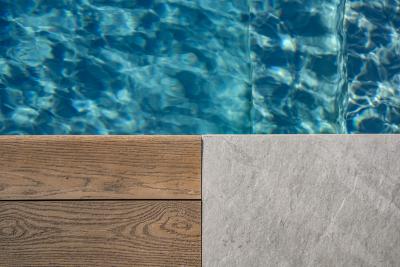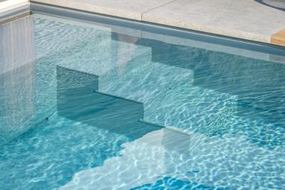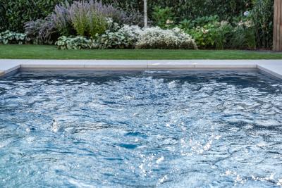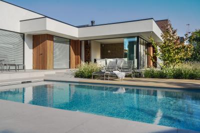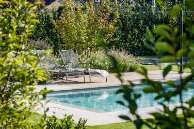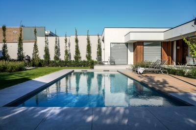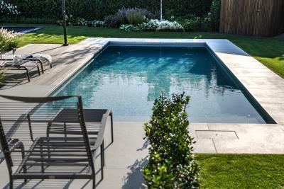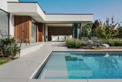 Het strak vormgegeven zwembad met ingebouwde tegenstroominstallatie nodigt uit tot zowel sportief zwemmen als rustig genieten. De twee stijlvolle zijtrappen zorgen voor een harmonieuze balans tussen functionaliteit en design, terwijl ze een natuurlijke toegang tot het water creëren.