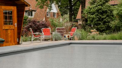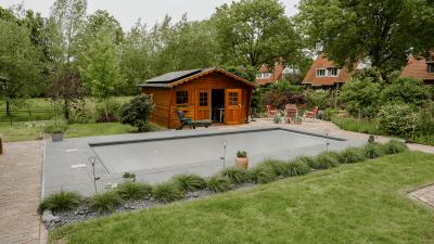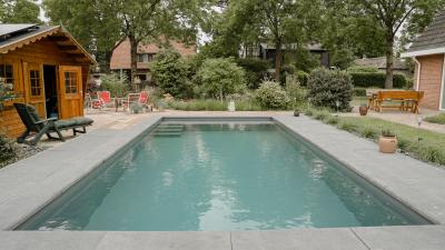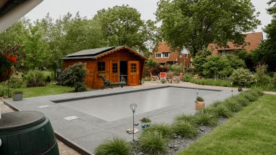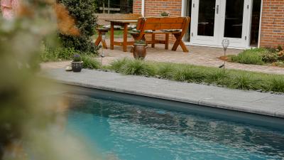 In deze kleurrijke en gezellige tuin in Soest hebben we een inbouwzwembad van 8 x 4 meter geplaatst, met een lamellenafdekkinig. Het zwembad is voorzien van een ingebouwde hoektrap met daaraan vast en verhoogde zitbank. Genoeg ruimte blijft er op deze manier over om baantjes te zwemmen, maar tegelijk ook om te relaxen en te zonnen op de zitbank.