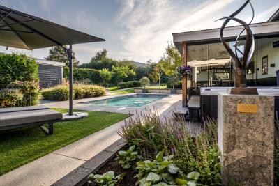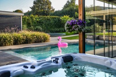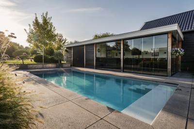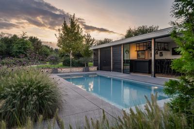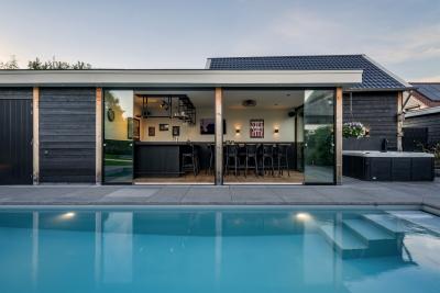 Of het nu gaat om ontspannen loungen overdag of gezellige momenten in de avond, deze combinatie van het zwembad en bar zorgt voor een echte vakantiebeleving in eigen tuin.
