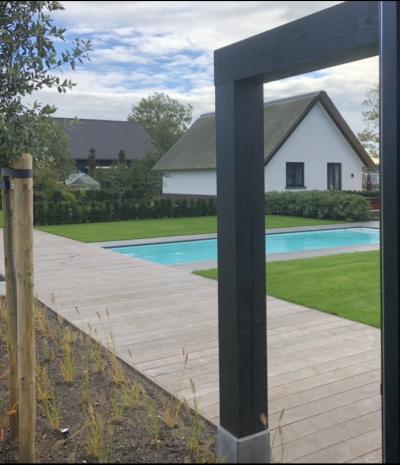 De familie heeft gekozen voor een solar lamellenafdekking. Deze lamellenafdekking zorgt dat het zwembad veilig en kindvriendelijk afgesloten kan worden. Ook is deze afdekking kostenbesparend en milieuvriendelijk. De afdekking is strak weggewerkt onder een verhoogde zitbank, waarop de familie heerlijk kan relaxen.